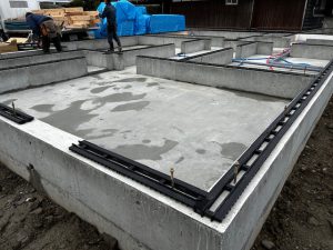 外回りの基礎の内側に断熱材を設置します。隙間がないように発砲ウレタンで継ぎ目をふさぎます。
