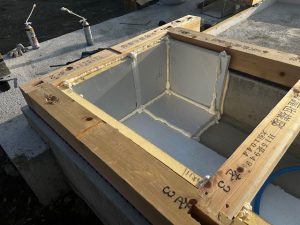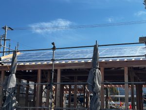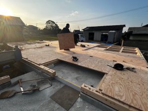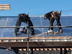 屋根仕舞いが、外断熱の気密工法なので、手間がかかりました。屋根の形を作る垂木という部材の上にアキレス社のQ1ボードという断熱材を設置して、その継目を気密テープで塞ぎ、その上に通気層を取るための通気胴縁を設置します。その上に従来の住宅と同じように野地板を設置して、ルーフィングを設置します。