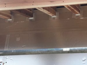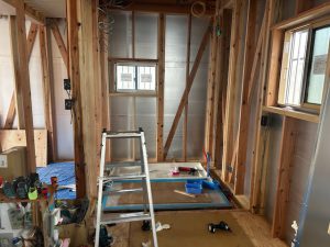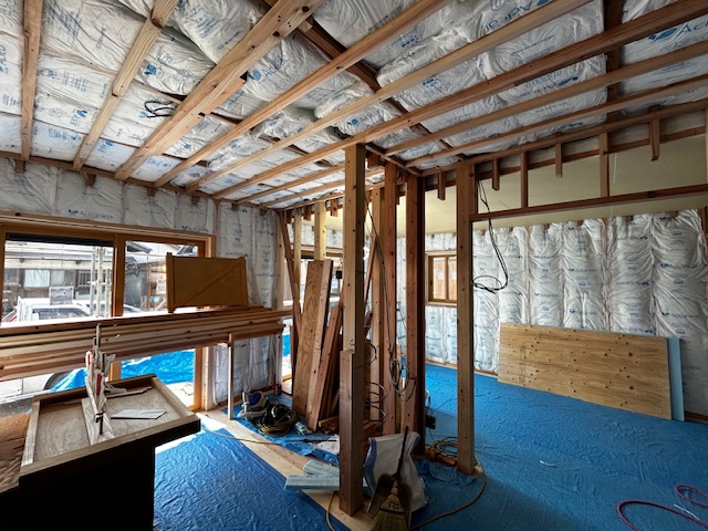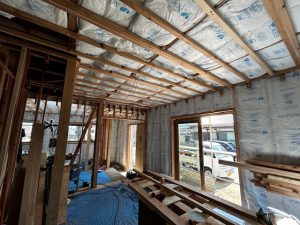 下では、外部の壁に断熱材を設置しています。断熱材の継目は、気密テープでしっかりふさぎます。