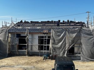 屋根工事をしています。屋根は平板の釉薬瓦を設置しています。